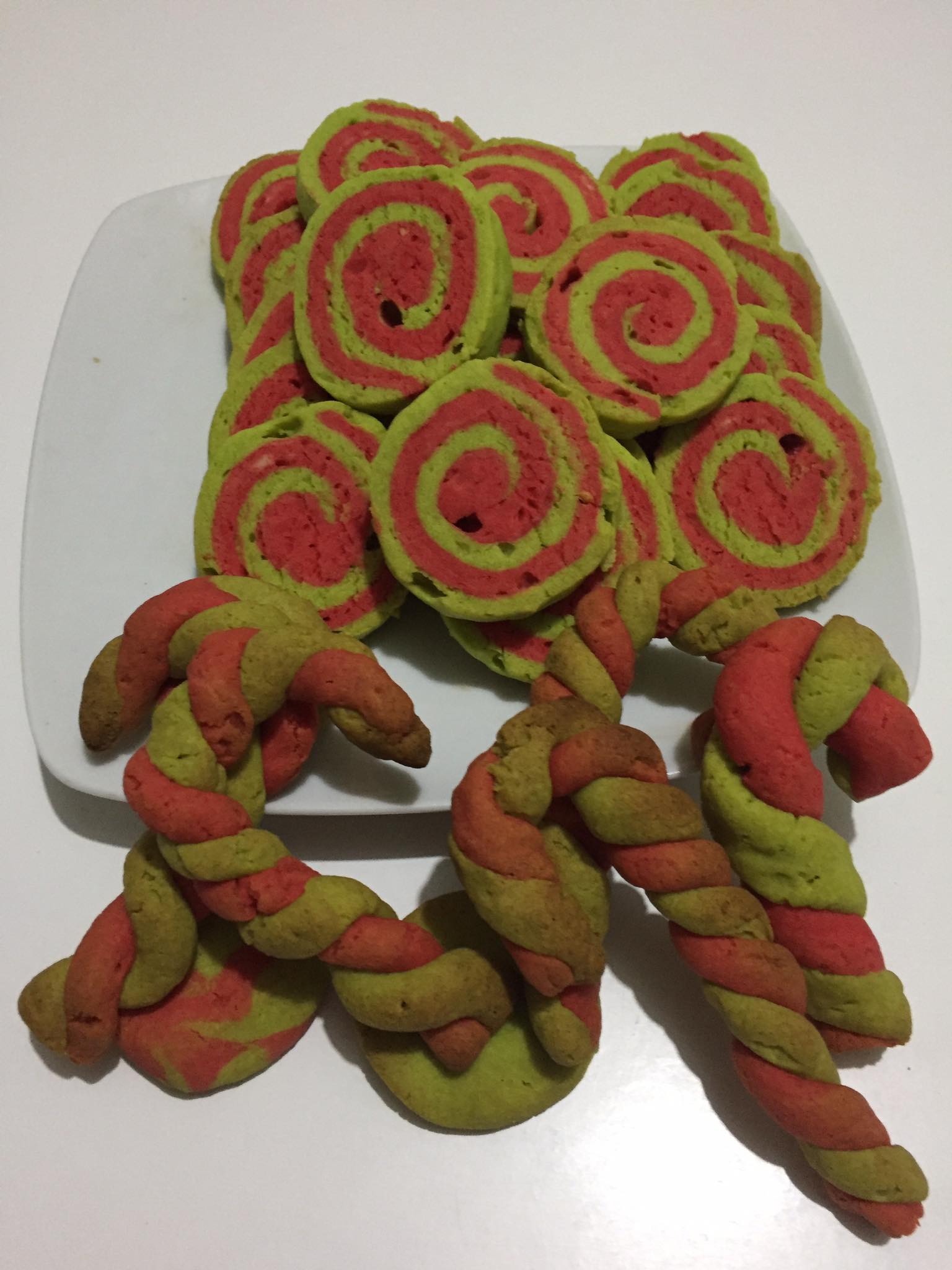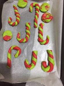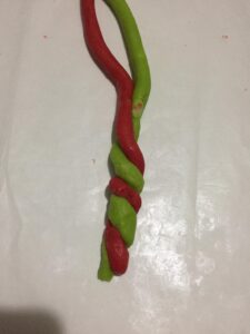 - Βγάζουμε τις μπάλες που σχηματίσαμε με τις περισσευούμεμες ζύμες και τις πλάθουμε στα χέρια μας, σχημτίζοντας μικρα κορδόνια απο κόκκινη και πράσινη ζύμη. Τυλίγουμε το ενα γύρω απο το αλλο φτίαχνοντας δίχρωμα μπαστουνακια.