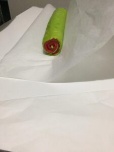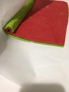 - Ακολουθούμε τον ίδιο τρόπο και για την κόκκινη ζύμη. Δηλαδή, την ανοίγουμε πάνω σε αντικολλητικό χαρτί.