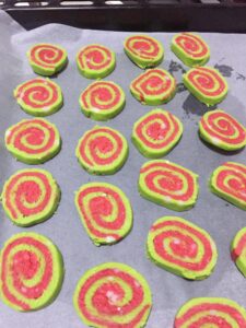 - Βγάζουμε το ρολό από το ψυγείο και ανοίγουμε προσεκτικά τη μεμβράνη. Με ένα μαχαίρι κόβουμε μπισκοτάκια πάχους 6 χιλιοστών περίπου και τα τοποθετούμε στις λαμαρίνες με απόσταση το ένα από το άλλο. Τα ψήνουμε στο φούρνο.