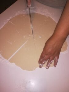 - Ανοίγουμε τη ζύμη με τον πλάστη, σε δίσκο με διάμετρο 40 εκ., αλευρώνοντας ελαφρά για να μην κολλάει. Χαράζουμε το δίσκο ακτινωτά σε 24 ίσα τρίγωνα κομμάτια (σαν πίτσα).