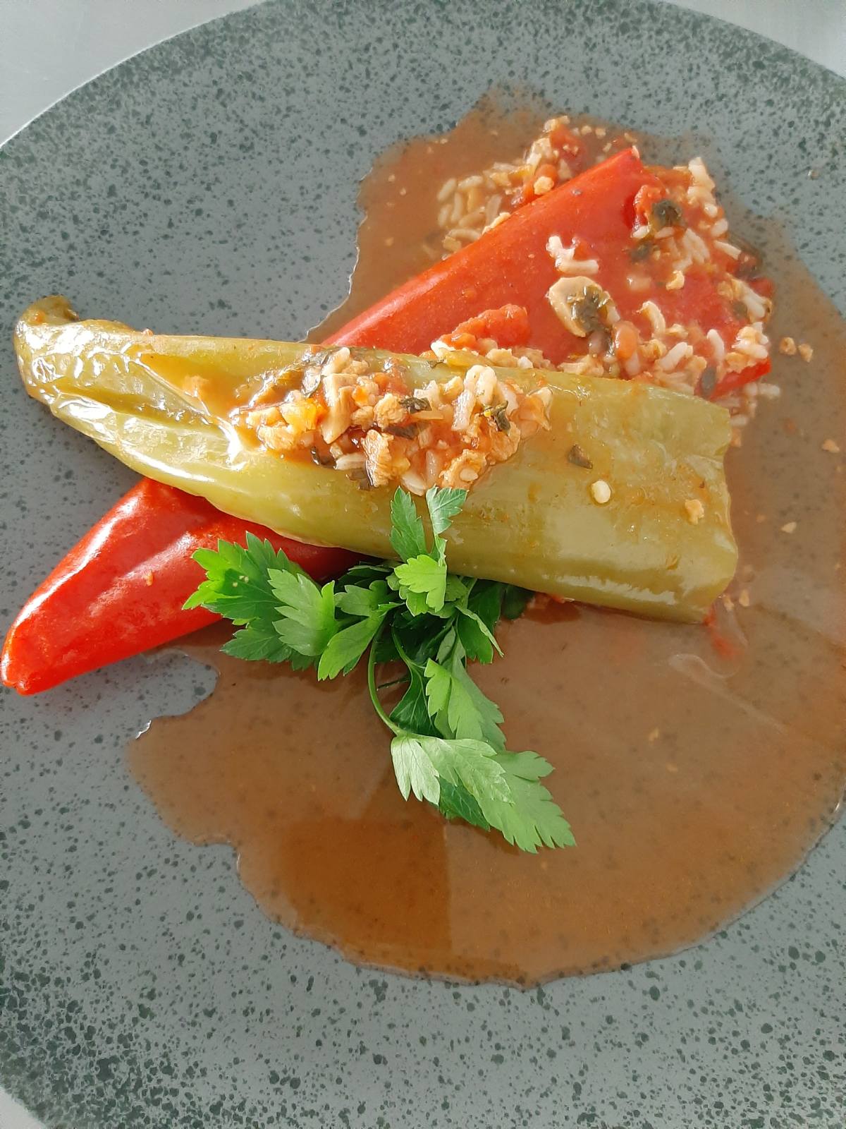 • Γεμίζουμε τις πιπεριές μας με τη βοήθεια ενός κουταλιού με τη γέμιση μέχρι τα ¾ για να μην βγει το ρύζι έξω όταν φουσκώσει στο ψήσιμο.