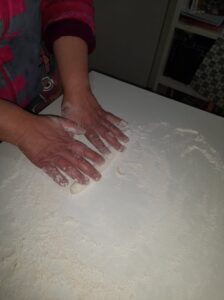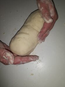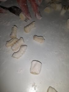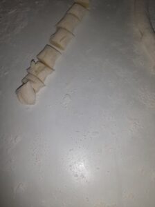- Κρατάμε τη ζύμη σκεπασμένη με μια πετσέτα για να μην στεγνώσει και παίρνουμε ένα μικρό κομμάτι κάθε φορά. Το πλάθουμε μέχρι να αποκτήσουμε λωρίδες ζύμης. Κι έπειτα με ένα ίσιο μαχαίρι κόβουμε μικρά κομμάτια ζύμης. Πιέζουμε τα κομμάτια σχηματίζοντας μια συμπαγή μπάλα, ζυμώνοντας ελαφρά στις παλάμες μας (για να γίνουν στρογγυλά).