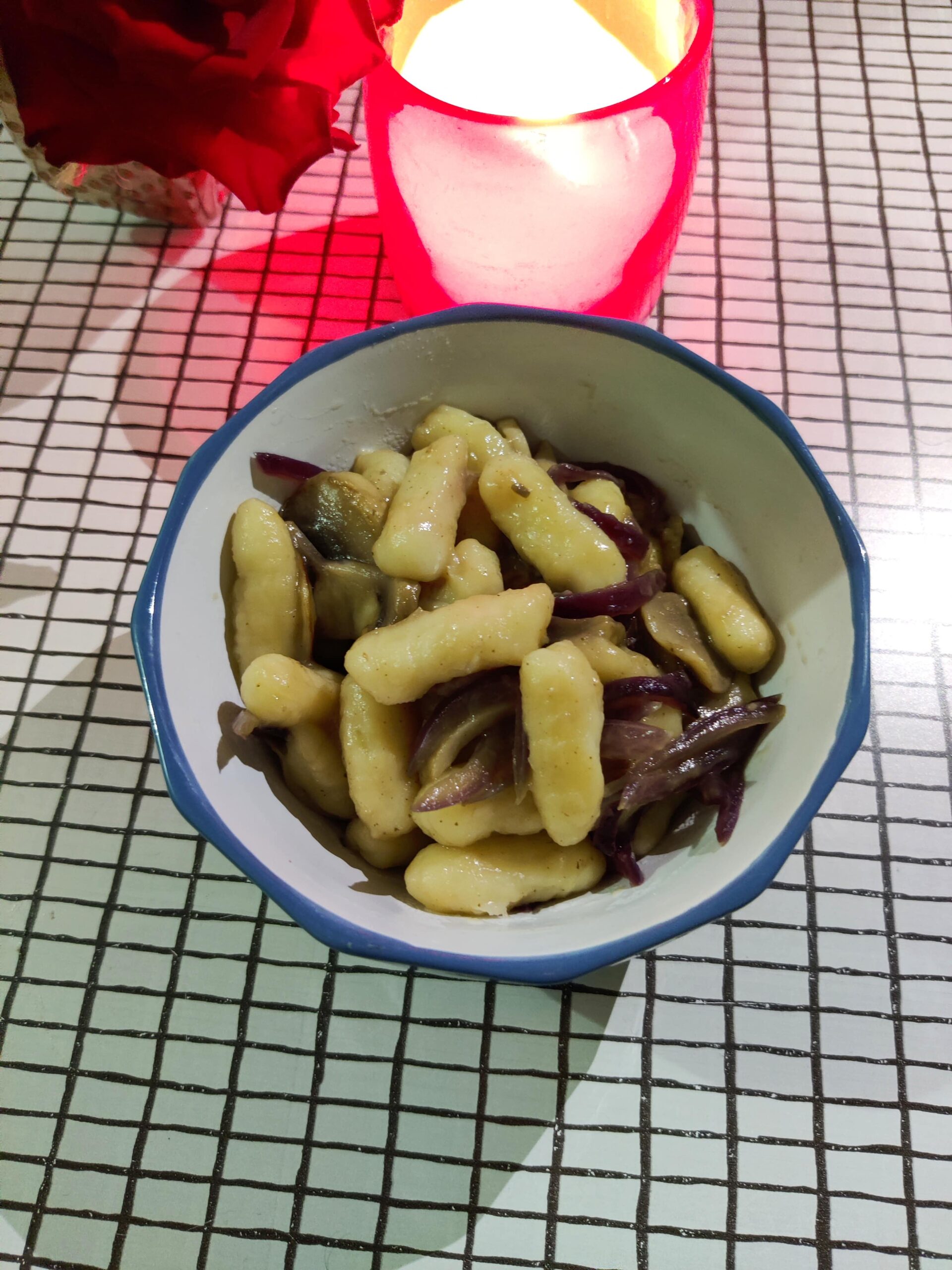 - Σε ένα τηγάνι ρίχνουμε 2 κ.σ. ελαιόλαδο, και όταν πάρει καλή βράση ρίχνουμε το κρεμμύδι, τα μανιτάρια και σοτάρουμε. Όταν καραμελώσουν ρίχνουμε και τα νιόκκι και συνεχίζουμε το σοτάρισμα για ακόμα 1 λεπτό. Και σερβίρουμε.